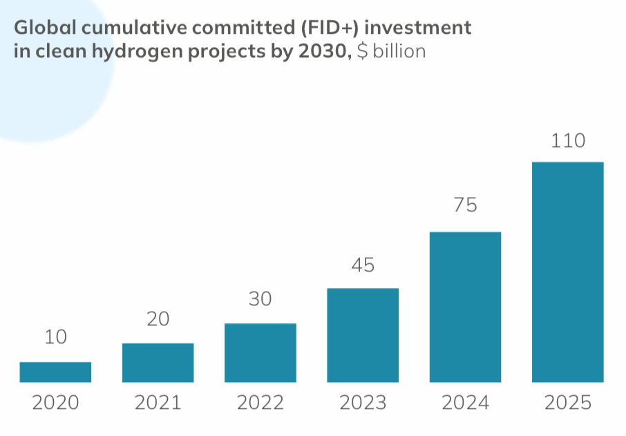 Das bestätigte globale Investitionsvolumen in sauberen Wasserstoff beträgt rund 110 Milliarden Dollar gegenüber 75 Milliarden im vergangenen Jahr. © Grafik aus Global Hydrogen Compass 2025