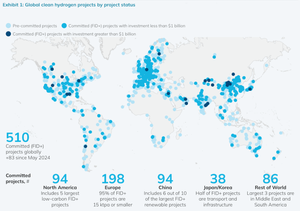 Von den 510 weltweit bestätigten Wasserstoffprojekten kamen 83 seit Mai 2024 hinzu. © Grafik aus Global Hydrogen Compass 2025