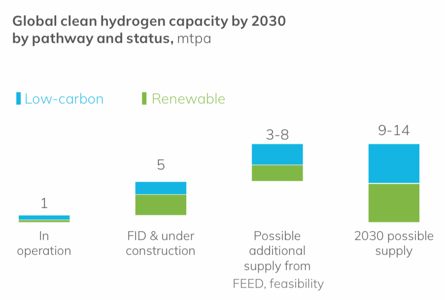 Dies geht aus dem „Global Hydrogen Compass“ hervor, den die Unternehmensorganisation Hydrogen Council gemeinsam mit McKinsey & Company verfasst hat. Die Studie spricht zumeist von „clean hydrogen“, was nicht zwingend mit der in der Regel in Europa genutzten Definition von „grünem“ Wasserstoff aus erneuerbaren Energien gleichzusetzen ist. In einigen Weltregionen – etwa in den USA – gilt auch Wasserstoff, der zum Beispiel mittels Atomstrom hergestellt wird, als „emissionsarm“, weil es im Produktionsprozess keinen CO2-Ausstoß gibt („low carbon hydrogen“).