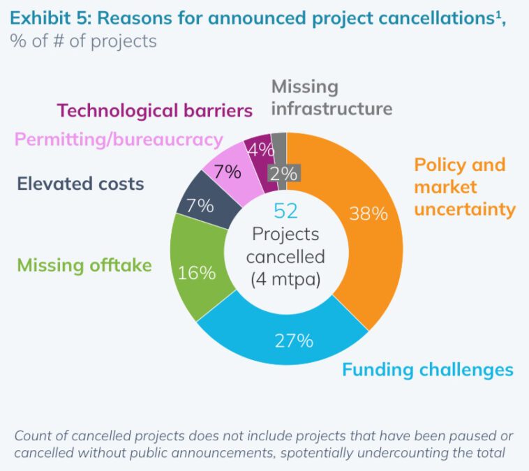 Hauptgründe für Projektabsagen sind mangelnde politische Unterstützung. Damit einher gehen eine Verunsicherung der Märkte und Finanzierungsschwierigkeiten. Infrastrukturelle oder technologische Probleme gibt es hingegen kaum. © Grafik aus Global Hydrogen Compass 2025