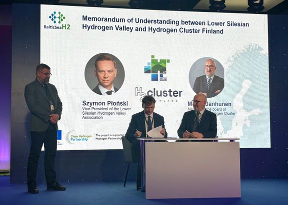 Die finnisch-polnische Zusammenarbeit wurde von Marko Janhunen (Hydrogen Cluster Finland) und Szymon Plonksi (Lower Silesian Hydrogen Valley Association) besiegelt. © Hydrogen Cluster Finland