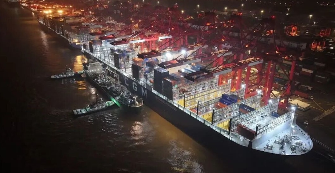 Shanghai Electric bunkert im Hafen von Yangshan in Shanghai erstmals große Mengen Biomethanol in der „Osmium“ des französischen Schifffahrts- und Logistikunternehmens CMA CGM. © Shanghai Electric Group