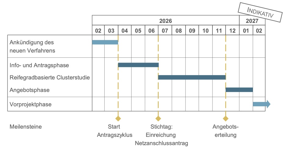 Für die Einführung des neuen Reifegradverfahrens seien mehrere Schritte erforderlich, die sowohl die Übergangsphase als auch die Vorbereitung des ersten Antragszyklus umfassten. Demnach gelte zunächst eine Übergangsregelung: Bereits erteilte Netzanschlusszusagen behielten ihre Gültigkeit. Alle derzeit in Prüfung befindlichen sowie bis zum Start des neuen Verfahrens eingehende Anträge könnten in das Reifegradverfahren überführt oder alternativ zurückgezogen werden.