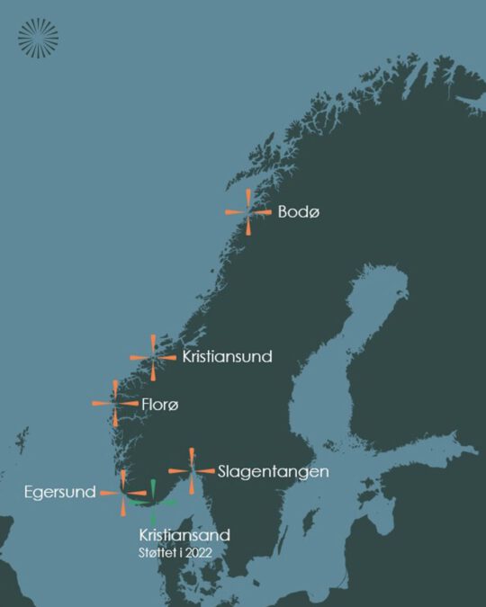 - Kristiansund (Møre og Romsdal) von GreenH AS (119 Millionen Kronen; 10,14 Millionen Euro). Nel ASA soll Elektrolyseure in einer noch nicht genannten Größenordnung liefern, nach eigener Einschätzung auch hier „mindestens zehn Megawatt“. Auf der Vestbase in Kristiansund, einem der am stärksten frequentierten maritimen Stützpunkte des Landes mit über 16.000 jährlichen Hafenanläufen, will GreenH zudem gemeinsam mit NorSea eine Anlage zum Bunkern von Wasserstoff auf Schiffen entwickeln.