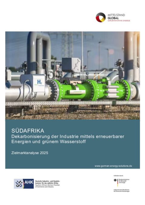 Die Zielmarktanalyse „Südafrika: Dekarbonisierung der Industrie mittels erneuerbarer Energien und grünem Wasserstoff“ gibt es kostenfrei als PDF (Deutsch, 26 Seiten). Herausgeber ist die Deutsche Industrie- und Handelskammer für das Südliche Afrika.